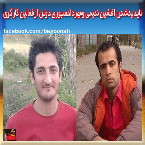به گزارش رسیده افشین ندیمی ومهرداد صبوری از اعضای کمیته هماهنگی برای کمک به ایجاد تشکل های کارگری که مدتی به کار کارگری در کردستان عراق مشغول بودند .شش روز پیش هنگام بازگشت به ایران در منطقه بانه ناپدید شده اند. آنها زمانی که به خاک ایران وارد شده بودند با یکی از دوستان خود تماس گرفته بودند ولی از آن لحضه به بعد هیچ خبری از سرنوشت این 2 فعال کارگری در دست نیست.