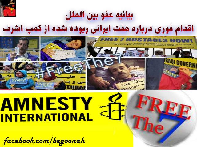 عفو بين الملل دريك بيانيه اقدام فوري اعلام كرد: درمورد هفت ايراني تبعيدي ربوده شده از كمپ اشرف برخي گزارشها حاكيست كه آنها در دست مقامات عراقي هستند و با تهديد شكنجه و بدرفتاري روبرو هستند و ممكن است به زور به ايران بازگردانده شوند.