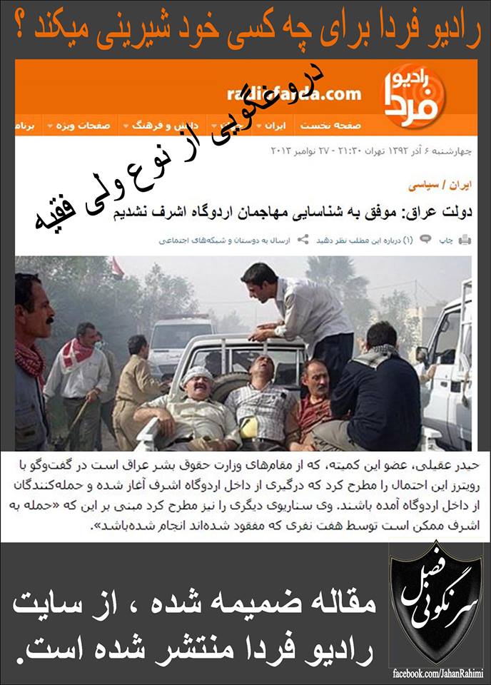 رادیو مغلطه فردا دست پروده کاخ سفید و وزارت خارجه امریکا با ماموران بخدمت گرفته از وزارت بدنام اطلاعات ولایت فقیه است .رادیو فردا و بی بی سی و … صد در صد صدای استعمار و ارتجاع و علیه مقاومت ملت ایران هستند. سازمان مجاهدين تابحال دراطلاعيه هاي مختلف با رد و نشاني و آدرس دقيق گفته است كه گروگانها درعراق بسر ميبرند و درآخرين اطلاعيه هم مجددا با دادن اطلاع ديگري مشخص كردند كه گروگانها دركدام خانه امن در كجاي بغداد ميباشند، اين خبر فقط براي اين است كه دستهاي مالكي را از اين جنايت بشويند و بعداز قتل عام 52 نفر عليرغم اينكه حتي يك عدد ميوه نميتوانست از حفاظ نيروهاي محافظ عراق كه دورتا دور اشرف را محاصره كرده بودند عبور كند. ولي اين تعداد قاتل به داخل اشرف رفته و دست به انفجار و قتل عام ميزنند. در كجاي دنيا و در كدام قانوني از قاتل ميخواهند در باره جنايتي كه مرتكب شده تحقيق هم بكند!