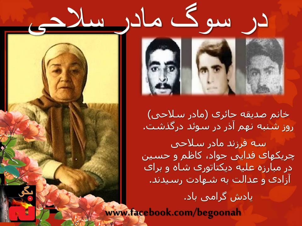 درگذشت مادر سلاحی را از جانب خودم و رفقایم در سازمان چریکهای فدایی خلق ایران به فرزندان و فامیل مادر سلاحی، به خانواده شهدا و زندانیان سیاسی و به همه آزادیخواهان ایران تسلیت می گویم.