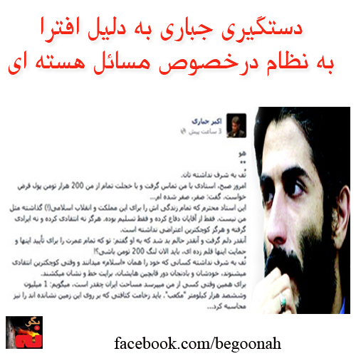 به گزارش سایت حکومتی دنا، اکبر جباری، از حامیان احمدی نژاد بدلیل ”افترا به نظام در خصوص مسائل هسته ای“ بازداشت شد.