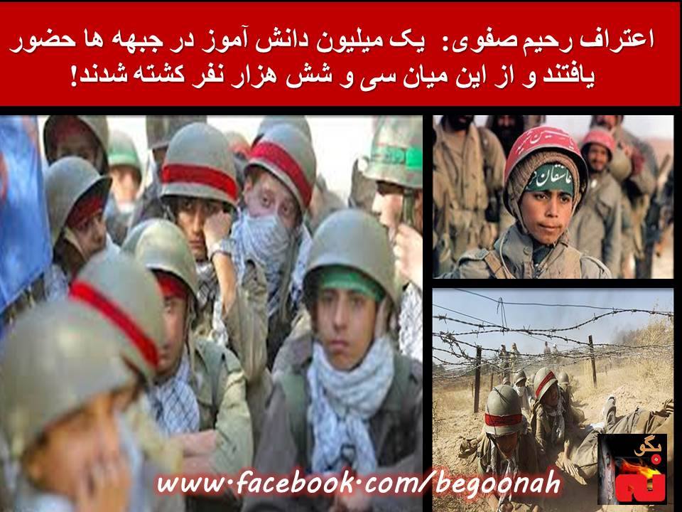 وي جنگ خانمانسوز ضد ميهني را، كه يك ميليون كشته و هزار ميليارد دلار خسارت در طرف ايران برجاي گذاشت، «يك پديده الهامبخش و لذتآفرين» خواند و به يك فقره جنايت بزرگ جنگي، يعني اعزام يك ميليون دانش آموز به جبهه جنگ اعتراف كرد. وي گفت: «امام توانستند در دوران جنگ حدود دو ميليون نفر را عازم جبهههاي نبرد كنند اين آمار به غير از نيروهايي است كه موظف به حضور در جبهه بودهاند… يك ميليون دانشآموز در جبههها حضور يافتند».