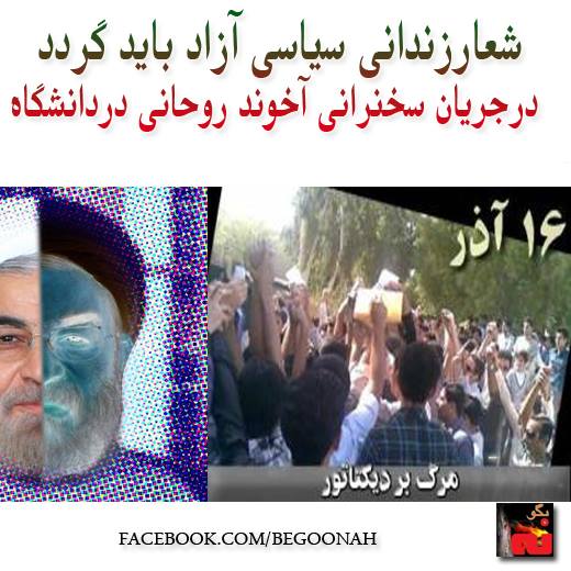 در جريان سخنرانی امروز آخوند حسن روحانی در دانشگاه ملی در تهران به رغم محدوديتها و کنترلهای شديد امنيتی، جمعی از حاضران شعار ”زندانی سياسی آزاد بايد گردد“ ، سردادند.