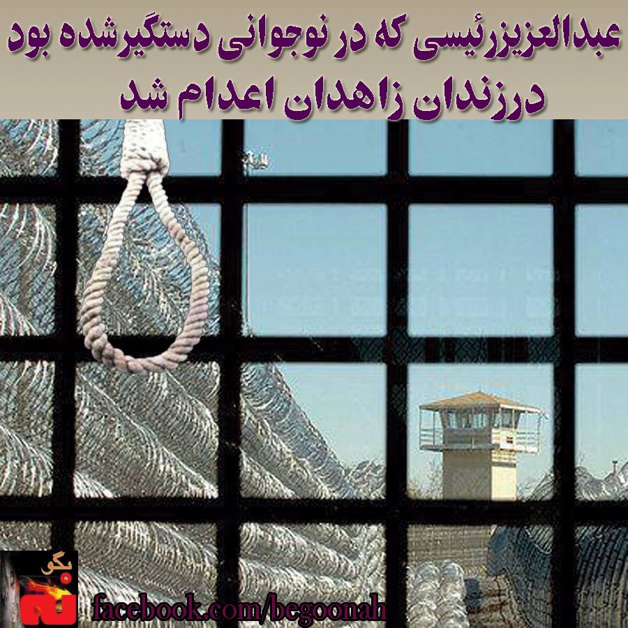 فعالین حقوق بشر و دمکراسی در ایران گزارش داد، روز دوشنبه ۲۵ آذر ماه زندانی به نام عبدالعزیز رئیسی ۲۴ ساله در محوطه زندان مرکزی زاهدان به دار آویخته شد. او در سنین نوجوانی دستگیر شده بود. این نوجوان ابتدا در کانون اصلاح و تربیت زندانی بود و سپس به بند ۱ معروف به بند جوانان زندان زاهدان منتقل گردید و حدودا ۷ سال زندانی بود.تا اینکه روز گذشته بطور مخفیانه در زندان مرکزی زاهدان اعدام شد.