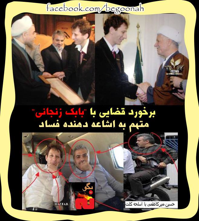 نمایندگان مجلس ارتجاع نوشته اند از مصادیق این فساد بابک زنجانی است که به عنوان ثروتمندی همه فن حریف در همۀ صحنهها جولان می دهد و با تکبر همه چیز را خریدنی می داند.آنها صدا و سیمای رژیم را به مماشات با بابک زنجانی و یا به قول خودشان ادامۀ سیاست «آدم شویی» در قبال بابک زنجانی متهم کرده اند.به گفتۀ آنان، «بابک زنجانی به تصریح مکاتبات بانک مرکزی با مدارک سجلی جعلی در بانک های مختلف حساب باز کرده» و در این بین نه تنها با مانعی روبرو نمی شود بلکه از آنها تسهیلات نیز می گیرد. در جای دیگری از نامۀ سرگشاده شان وزارت اطلاعات و نهادهای اطلاعاتی جمهوری اسلامی را به پشتیبانی از بابک زنجانی متهم دانسته و افزودهاند: بابک زنجانی امین وزارت نفت جمهوری اسلامی است و پول نفت فروختۀ شدۀ کشور را برای مدت ها پس نمی دهد، بی آنکه نگرانی در این بین به دل راه بدهد. آنها همچنین رییس کمیسیون اصل نود مجلس شورای اسلامی را که از سوی خود مجلس برگزیده شده پشتیبان سرسخت بابک زنجانی معرفی کرده اند.