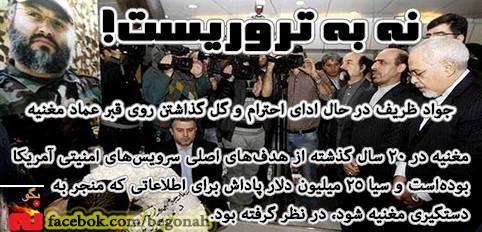فرمانده نظامی حزب الله و یکی از بزرگترین تروریست های سی سال اخیر در جهان. اگر خاتمی از اسدالله لاجوردی قصاب اوین قدردانی کرد، طبیعتا وزیر خارجه هم از معاد مغنیه، تروریست و گروگان گیر قدردانی میکند
