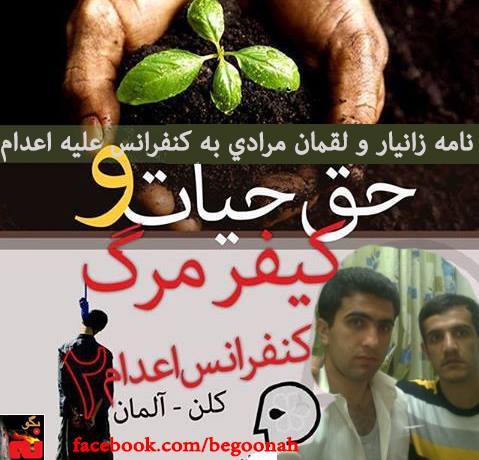 مطلع شديم که در کلن آلمان کنفرانسي دو روزه در مورد اعدام در جريان است. ما زانيار و لقمان مرادي از رجايي شهر کرج هستيم٬ قبل از هر چيز ٬ از اينکه در مورد اعدامها حرف ميزنيد و فعاليت ميکنيد خوشحاليم٬ براي ما که در سلول مرگ نشسته ايم اين اخبار دلگرم کننده است. قبل از اينکه در مورد خودمان حرف بزنيم٬ ميخواهم دو اتفاق را که همين ديروز در اينجا افتاد بگويم و از شما بخواهم براي آزادي و دفاع از زندانيان سالمند هم کاري بکنيد. روز گذشته محمد امير خيزي يک زنداني سالمند از پله ها افتاد و سر و دستش شکست٬ او را به بيمارستان دي منتقل کردند٬ نميدانم الان وضعش چطور است. ساعاتي بعد از اين واقعه٬ حال کريم عزيز معروف٬ زنداني ۸۰ ساله از کردستان عراق که به اتهام جاسوسي در زندان است٬ شديدا بهم خورد٬ او را به بيمارستان منتقل کردند٬ شنيديم که کيسه صفرايش ترکيده و با اين سن و سال خطر مرگ او را تهديد ميکند. کريم عزيز معروف ۱۷ سال است در زندان است اکنون ۸۰ سال سن دارد. آيا اين ظلم نيست که فردي با اين سن و سال در چنين موقعيتي است؟