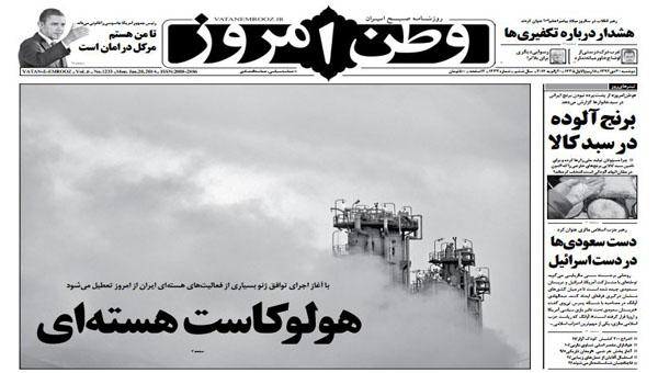 از سوی دیگر، روزنامه وطن امروز چاپ تهران صفحه اول خود را در اعتراض به اجرای توافق ژنو به صورت سیاه و سفید چاپ کرد و تیتر «هولوکاست هستهای» را انتخاب نمود و ناصر نوبری سفیر پیشین ایران در شوری سابق در یادداشتی، با انتقاد شدید از توافق ژنو، نوشت: «دیگر ما اهرم فشاری برای طرف مقابل نداریم که آنها را وادار کنیم به خواستهمان تمکین کنند و همانطور که تیم مذاکرهکننده گفتهاند برای گام دراز مدت کار سختی در پیش است و باید مردم دعا کنند. این کلمه آخر درستترین واژه است و با اجرای موافقتنامه ژنو از امروز دیگر چیزی در دستمان نمانده و از این به بعد راهی جز دعا و راز و نیاز و نذر برایمان باقی نمانده است.»