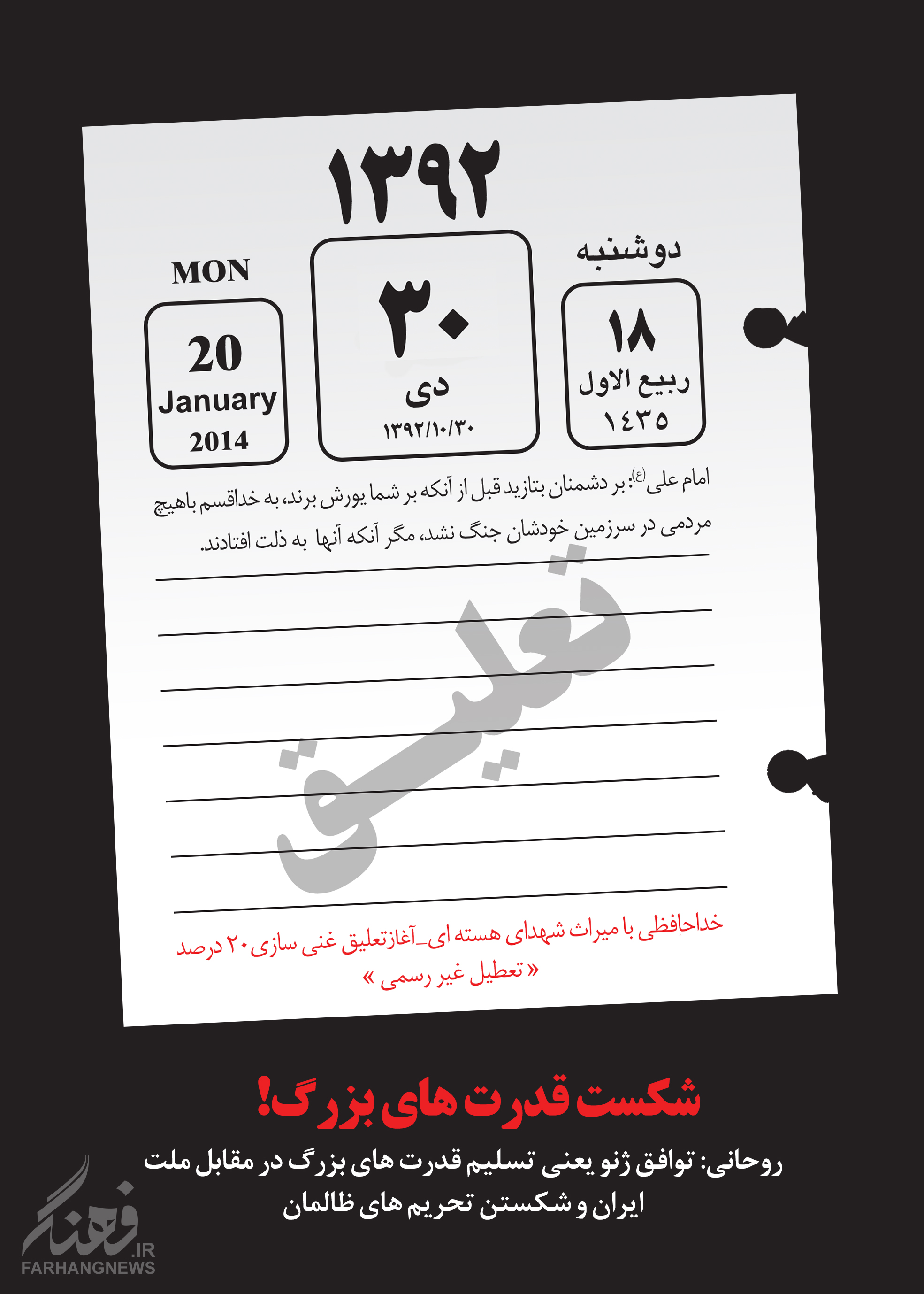 برگرفته از سایت حکومتی فرهنگ نیوز: ۳۰ دی ماه ۱۳۹۲ روزی خاص در تقویم کشورمان را رقم زد. روزی که غنی سازی ۲۰ درصد اورانیوم که دستاورد شهدای هسته ای کشورمان بود، متوقف شده و تجهیزات آن با نظارت بازرسان آژانس انرژی اتمی پلمپ شد. همچنین رسانه ها در باره این واقعه از عبارات «هولوکاست هسته ای» و «اکسیری که اکسید شد» استفاده نمودند. پوستر زیر امروز در شبکه های اجتماعی منتشر شد