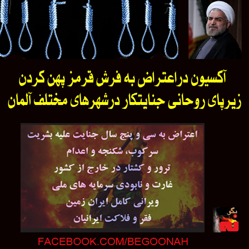 در اعتراض به فرش قرمز پهن کردن زير پاي روحاني در آلمان، ايرانيان معترض به اعدامها در ايران٬ به دفاتر احزاب حاکم در آلمان٬ طناب دار هديه ميدهند!