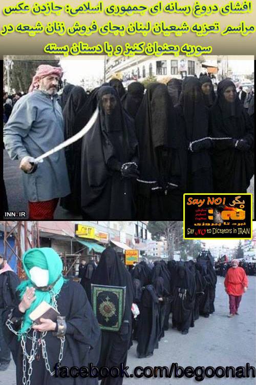 در روزهای گذشته رسانه های حکومتی جمهوری اسلامی (از جمله فارس ، ایسنا ، قدس آنلاین ، شبکه خبر ، افسران جنگ نرم و …) اقدام به قرار دادن خبری در خروجی خود با استناد به عکس مردی شمشیر بدست و با این عنوان که مخالفان بشار اسد در سوریه ، ضمن گرداندن زنان به اسارت گرفته شده چادری! ، اقدام به فروش این زنان «شیعه» بعنوان کنیز می کنند ، نموده اند .