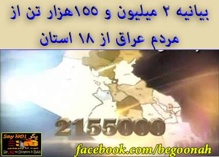 امضاکنندگان اين بيانيه با ابراز انزجار از نفوذ ويرانگر رژيم ايران در عراق يادآور شدند: ”رژيم ايران با شعله ور کردن جنگ فرقه يی و دامن زدن به اعمال تروريستی در عراق، خون دهها هزار بی گناه را برزمين ريخته و ميليونها عراقی را آواره کرده و حاکميت عراق را تحت نفوذ شديد خود قرار داده است… .