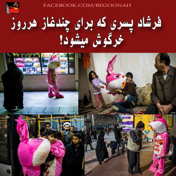 فرشاد ۱۵ سال بیشتر ندارد و روزی ۱۲ ساعت به شکل خرگوش درمیآید تا نظر مردم را به یک فروشگاه اسباببازی و لوازم کودک جلب کند. او برای این که بتواند به خرج خانواده ۵ نفرهشان کمک کند، مجبور است از ساعت ۸ صبح تا ۸ شب کار کند و در ماه ۳۰۰ هزارتومان مزد میگیرد. منابع رسمی حکومتی تعداد کودکان کار را بیش از ۳ میلیون و به طور غیر رسمی ۷ میلیون نفر اعلام کردهاند. فرشاد یکی از آنهاست.