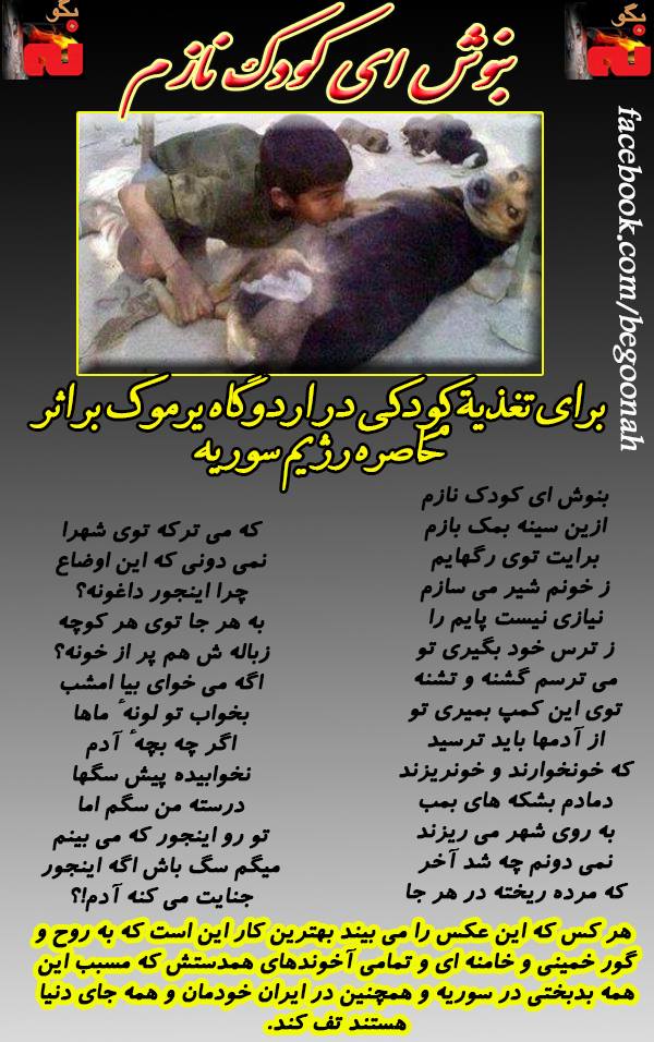 ـ هر کس که اين عکس را می بيند بهترين کار اين است که به روح و گور خمينی و خامنه ای و تمامی آخوندهای همدستش که مسبب اين همه بدبختی در سوريه و همچنين در ايران خودمان و همه جای دنيا هستند تف کند.
