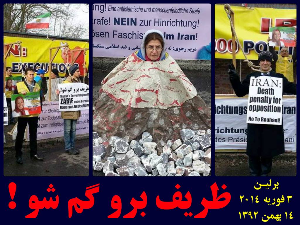 ایرانیان آزاده در برلین امروز دوشنبه ۱۴ بهمن ماه ۹۲برابر با سوم فوریه ۲۰۱۴ در اعتراض به حضور تروریست ظریف فرستاده دیکتاتوری پلید ولایت فقیه به برلین دست به گردهم آیی اعتراضی زدند. شرکت کنندگان که در مقابل محل جلسه ای که ظریف برای ملاقات در آن در برلین حاضر شده بود یکصدا فریاد میزدند: ظریف برو گم شو ! آخوندها باید گورشان را گم کنند ! با آخوندها معامله نکنید ! دستی که امروز توی دست ملاست، اونم شریک جرم آن آخوندهاست ! مرگ بر اصل ولایت فقیه، زنده باد آزادی و