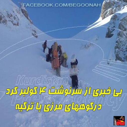 چهار تن از هموطنان کُرد که به منظور کولبری به روستای «گلیشه» در کُردستان ترکیه رفتهاند، طی چهار روز اخیر از سرنوشت آنان اطلاعی در دسترس نمیباشدو اطلاعی از سرنوشت آنان در دسترس نیست. این بیخبری باعث نگرانی هموطنان و خانواده این کولبران شده است. به گزارش کُردپا، این کولبران روز جمعه یازدهم بهمنماه به منظور کولبری به روستای گلیشه ترکیه رفته بودند و تاکنون ساکنین منطقه موفق به پیدا کردن هیچکدام از این کولبران نشدهاند و سرنوشت این کولبران در هالهای از ابهام قرار دارد.ساکنین مرزی کوهستانهای کردستان به دلیل نبود شغل مناسب و مشکلات مالی، به شغل پر مخاطرهی کولبری روی برده که علاوه با مخاطراتی که در راه های کوهستانی این قشر کم درآمدبا آن روبرو هستند, هر روز شاهد کشته شدن تعدادی از این کولبران توسط نیروهای نظامی رژیم هستیم.