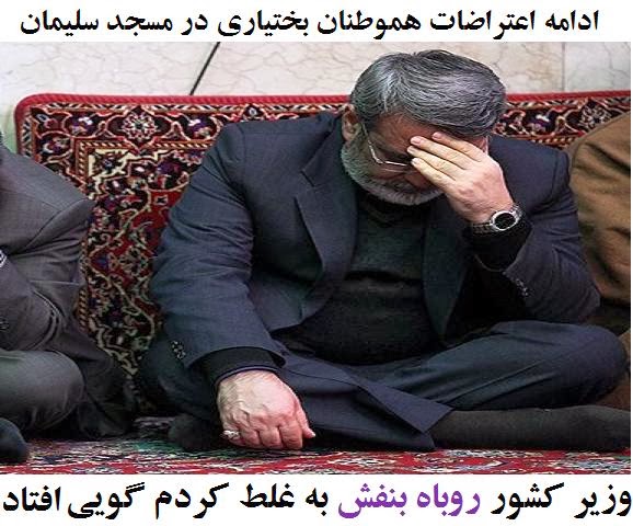 وزیر کشور دولت حسن روحانی به غلط کردم گویی افتاد !اعتراضات به پخش سریال تلوزیونی موهن با نام «سرزمین کهن» از سیمای ضد ملی حکومت آخوندها، یکشنبه 27 بهمن ماه توسط جوانان مسجد سلیمان ادامه یافت.