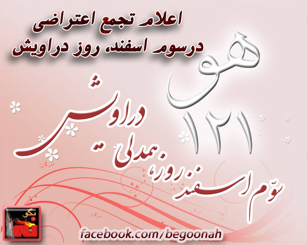 بنا به گزارشات دريافتي، به مناسبت سوم اسفند كه درايران روزدراويش اعلام كرده اند. درسايت هوالمحبوب كه مربوط به دراويش است،آمده است ”به دليل دستگيرئيها وخراب كردن حسينيه ها وتكيه ها، درمراكزي كه دراويش دارند جمع مي شوند واعتراض خود را ابرازمي كنند.