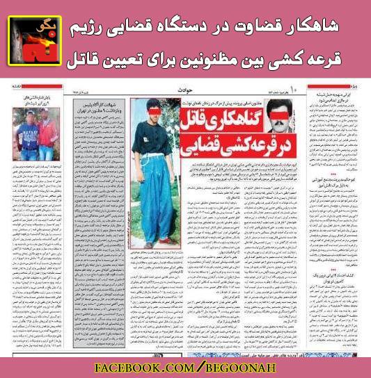 روزنامه حکومتی «وطن » نوشت: چندی قبل مردی در میدان انقلاب به قتل می رسد و در این میان دو نفر به عنوان مظنون دستگیر می شوند هر دوی آنها معتقداند که در نزاع شرکت داشته اما قتلی مرتکب نشدند اکنون بعد از گذشت ۲ سال و به دلیل مشخص نبودن قاتل ، قاضی شعبه 1156 دادگاه بعثت به قرعهکشیای عجیب دست زد و برای شناسایی قاتل اصلی نام هر دو مظنون را روی 2 کاغذ جداگانه نوشت و در حضور وکیل خانواده مقتول، به قرعهکشی دست زد تا مشخص شود چه کسی باید مجازات شود.