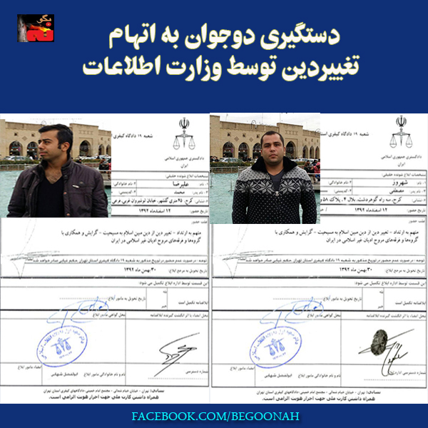 این دو جوان ایرانی که نسبت فامیلی دایی و خواهرزادگی باهم دارند، بدون هیچ دلیل و مدرکی از سوی نهادهای امنیتی مستقر در فرودگاه خمینی دستگیر شده و به مکانی نامعلوم منتقل میشوند که بعد از مدت یک هفته بازداشت، طی تماسی با خانوادهی این دوجوان ایرانی، اتهام آنها را برقراری با شبکههای دین مسیحیت خارج از کشور، ارتداد و تغییر دین از اسلام به مسیحیت و همچنین سازماندهی شدن به منظور ترویج دین مسیحیت در داخل ایران اعلام نمودهاند.