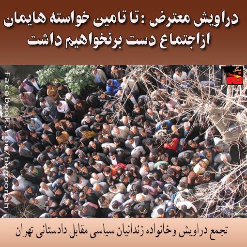 بنا به گزارش سايت مجذوبان نور «دراويش گنابادی حاضر در گردهمايی مقابل دادستانی تهران و همچنين دراويش بازداشت شده در کلانتری ۱۱۳ بازار در اقدامی هماهنگ اعلام کرده اند مادامی که خواسته های آنان در مورد برادران زندانيشان تأمين نشود از اجتماع خود دست برنخواهند داشت».