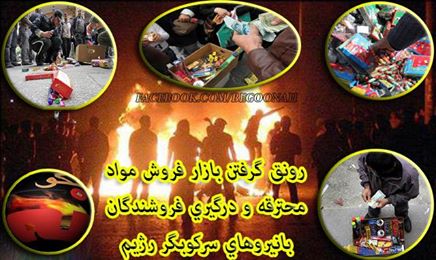 بر اساس گزارشي از تهران روز دوشنبه صبح ۱۹اسفند، نيرويهاي سر كوبگرانتظامي در خيابان ناصر خسرو كه قادر به كنترل فروش مواد محترقه چهارشنبه سوري نبودند با يورش به محل هاي فروشندگان مواد محترقه قصد جمع كردن بساط فروش مواد محترقه را داشتند اما فروشندگان با نيروي انتظامي در گير شده و مانع بر هم زدن كسب و كارشان شدند».