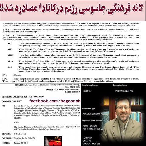 به دنبال تصویب قانون معروف به «C-10» (تعقیب قضایی کشورهای حامی تروریسم) در سال ۲۰۱۲، شاکیان آمریکایی که از دادگاههایی در آمریکا، حکم بر علیه سپاه پاسداران وزارت اطلاعات و نیز رژیم آخوندی در اختیار داشتند، موفق شدند از دادگاه عالی انتاریو نیز حکمی برای ضبط و حراج و فروش دو ساختمان متعلق به رژیم را در کانادا دریافت کنند. همچنین موجودی دو حساب بانکی نیز به نفع شاکیان مصادره شده است.