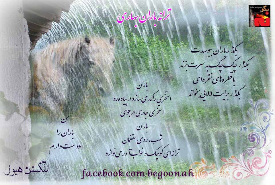 گالری فیلم و تصویر ترانۀ باران بهاری -از لنگستن هیوز Date: مارس 27, 2014Author: begoonah 0 دیدگاه بگذار باران ببوسدت بگذار چكچك به سرت بزند با قطرههای نقرهای بگذار برایت لالایی بخواند باران استخری راكد میسازد در پیادهرو استخری جاری در جوی باران شب، روی سقفمان ترانهای كوچك و خوابآور مینوازد من باران را دوست دارم اشتراکگذاری این:بیشتر برای اشتراکگذاشتن فیسبوک خود کلیک کنید (در پنجرۀ تازه باز میشود) فیسبوک اشتراک گذاشتن توسط اس ام اس (در پنجرۀ تازه باز میشود) X برای چاپ کردن کلیک کنید (در پنجرۀ تازه باز میشود) چاپ برای اشتراکگذاری روی Telegram کلیک کنید (در پنجرۀ تازه باز میشود) تلگرام برای اشتراکگذاری روی WhatsApp کلیک کنید (در پنجرۀ تازه باز میشود) واتساپ
