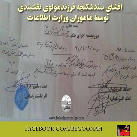 روز چهارشنبه ۲۰۱۴.۴.۲ سندی را منتشر کرد که نشان می دهد عبدالغفار نقشبندی فرزند مولوی فتحی محمد نقشبندی توسط ماموران وزارت اطلاعات شکنجه شده است.
