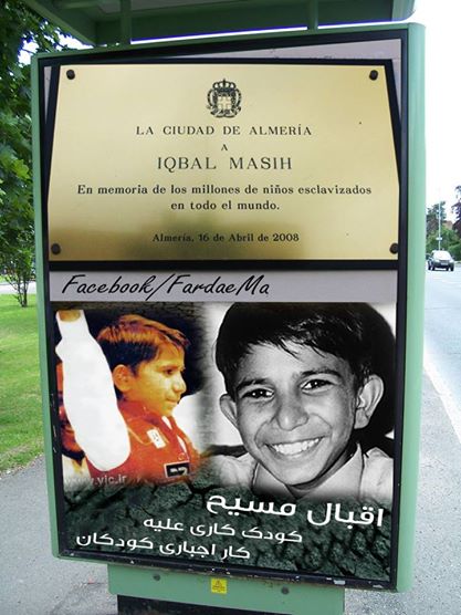 اقبال مسيح کودکی بود که در۴ سالگی به قيمت ۱۶دلار، به يک تاجر صاحب کارگاه های قاليبافی در پاکستان فروخته شد و به دايره بردگی ميليونها کودک بی نام ونشان پيوست.در سال ۱۹۹۳ به کمک نيروهائی که عليه کار اجباری کودکان مبارزه می کردند به سوئد و آمريکا سفر کرد و مبارزه براي بهره كشي از كودكان را شروع كرد.مبارزه اقبال، اثربخش بود. دولت وقت پاکستان برخی از اين گونه کارگاههای بافندگی و قاليبافی را تعطيل کرد.