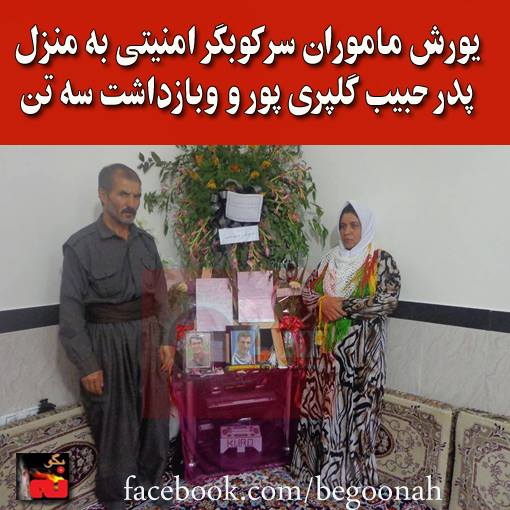 غروب روز چهارشنبه ٢٠ فروردين، مأموران اداره اطلاعات سنندج طى يورش به منزل پدر “حبيبالله گلپرى پور”، زندانى سياسى که سال گذشته در زندان اروميه اعدامشده، برادر وى و دو مهمان خانه را بازداشت کردند.