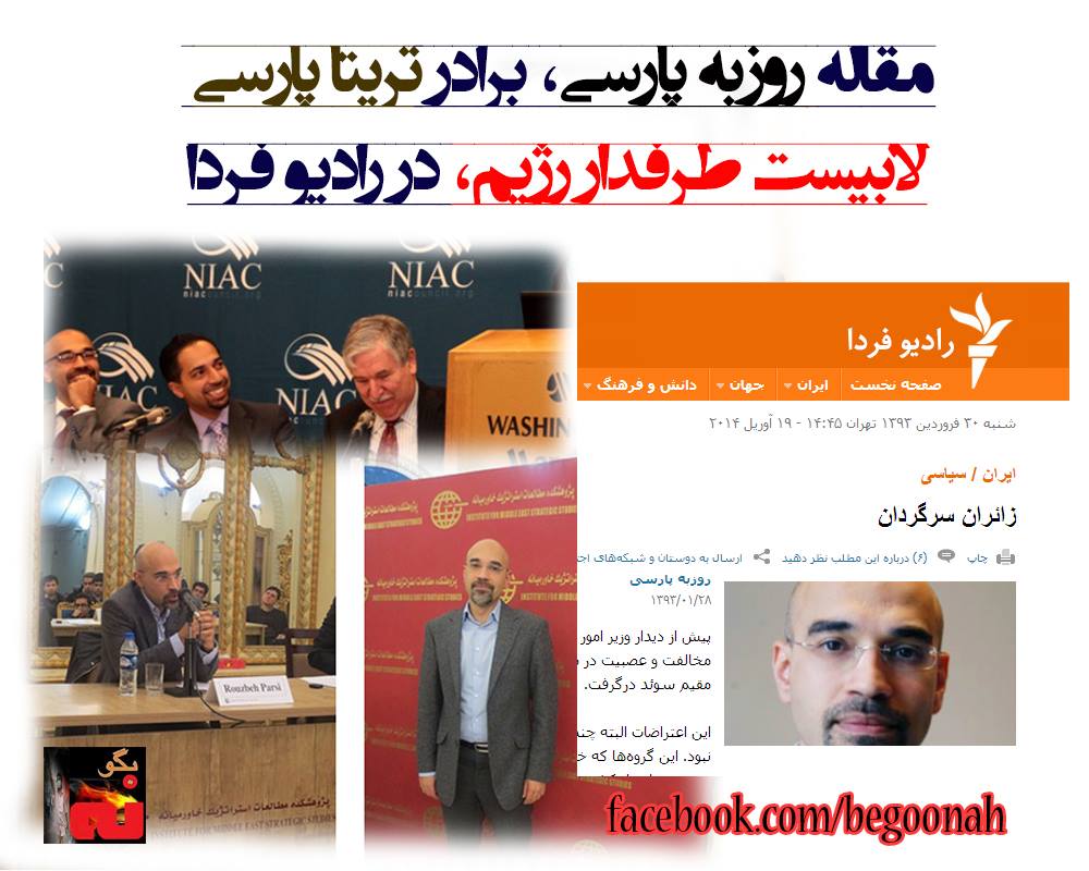 روزبه پارسی، برادر تریتا پارسی لابیست طرفدار رژیم، در مقاله ای در رادیو فردا به هموطنان آزادیخواه در خارج از کشور حمله کرده و با واژه های نامناسب، اپوزیسیون رژیم را مورد توهین قرار میدهد. پارسی ازاینکه روابطش با رژیم و رفت و آمد هایش به ایران و سخنرانی برای نهادهای رژیم لو رفته، بشدت ناراحت است و از تریبون رادیو فردا برای عقده گشائی، حمله به هموطنان و خدمت رسانی به رژیم استفاده کرده است.
