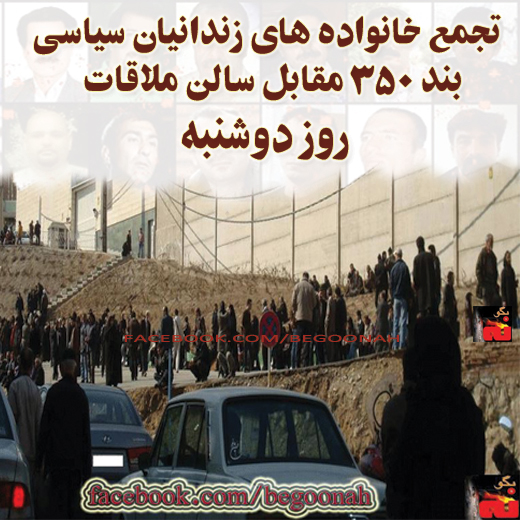 بنا بر اخبار رسیده جمعی از خانواده های زندانیان سیاسی بند ٣٥٠ اوین در اعتراض به حملات وحشیانه کارگزاران جنایتکار آخوندی به زندانیان سیاسی این بند و انتقال تعدادی از آنان به انفرادی ٢٤٠، فردا دوشنبه که روز معمول ملاقات آنهاست، از ساعات اولیه صبح در مقابل درب ورودی سالن ملاقات بند ٣٥٠ و ٢٤٠ تجمع خواهند کرد.