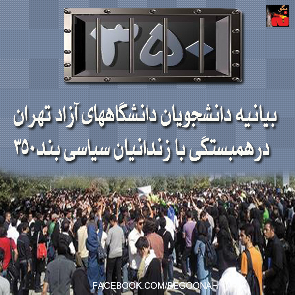 جمعی از دانشجويان دانشگاههای آزاد تهران، طی بيانيه يی حمله وحشيانه دژخيمان رژيم آخوندی به زندانيان سياسی بند ۳۵۰ اوين را محکوم کردند و با خانواده های آنان اعلام همبستگی کردند. در قسمتی از اين بيانيه آمده است: پيام مقاومت زندانيان در مشتها و فريادهای خانواده ها و جوانانی که به آنها پيوسته اند از ديوارها عبور کرد و سراسر ميهن را در نورديد، حالا پژواک اين پيام که پيام پايداری اشرف نشان به هرقيمت و در هر شرايطی هست، از عمق جامعه به گوش می رسد و ديده می شود. دشمن کور خوانده اگر فکر می کند با اين کارها، خللی در عزم ما برای سرنگون کردن اين ديکتاتوری، وارد می شود. ما عهد کرديم که ايران را از چنگال اين اهريمنان، آزاد کنيم.