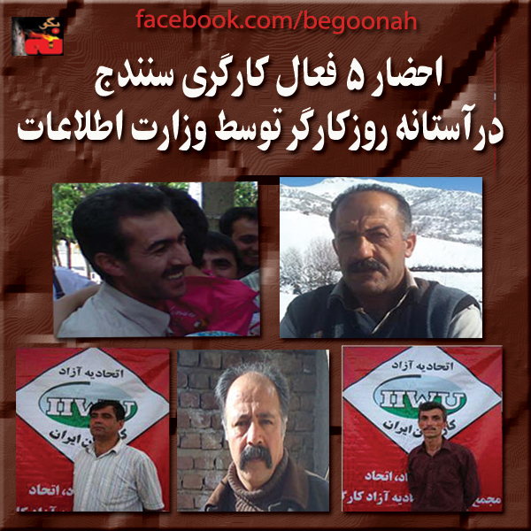 پنج نفر از اعضای هیات مدیره اتحادیه آزاد کارگرن ایران، در آستانه روز جهانی کارگر به اداره اطلاعات سنندج احضار شدند. بنا بر گزارش “اتحادیه آزاد کارگران”، صبح روز سه شنبه ۹ ارديبهشت ۱۳۹۳، شریف ساعده پناه، شیث امانی، صدیق کریمی، مظفر صالح نیا و خلیل کریمی، از اعضای هیات مدیره اتحادیه آزاد کارگران ایران به اداره اطلاعات شهر سنندج احضار شدند. طبق این گزارش، مظفر صالح نیا پس از بازجوئی و هشدار نسبت به برگزاری مراسم روز جهانی کارگر آزاد شده است و چهار نفر دیگر از اعضای هیات مدیره اتحادیه آزاد کارگران ایران آقایان شریف ساعد پناه، صدیق کریمی، شیث امانی و خلیل کریمی همچنان در اداره اطلاعات شهر سنندج هستند. اتحادیه آزاد کارگران ایران با اعتراض به احضار اعضای خود، اعمال فشار بر فعالین کارگری در آستانه اول ماه مه را قویا محکوم کرد و برگزاری مستقل مراسم این روز را توسط کارگران ایران حق مسلم آنان اعلام کرد.