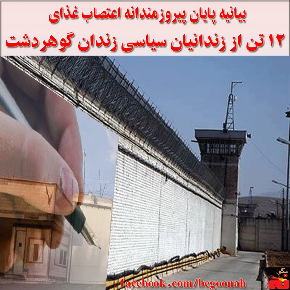 بیانیه پایان پیروزمندانه اعتصاب غذای ۱۲ زندانی سیاسی زندان گوهردشت که با ایستادگی و مقاومت آنها وخانواد ه های بزرگوار زندانیان سیاسی، رژیم ولی فقیه را وادار به عقب نشینی نمود.زندانیان بار دیگر بر تشکیل یک کمیته مستقل بین المللی به سرپرستی دکتر احمد شهید به منظور شناسایی آمرین و عاملین این جنایت و مجازلات قانونی آنها تاکید کردند. این بیانیه جهت اطلاع عموم و انتشار در رسانه ها در «اختیار فعالین حقوق بشر و دمکراسی در ایران » قرار داده شده است. متن بیانیه به قرار زیر می باشد: