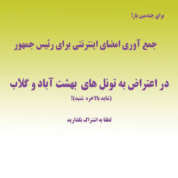 سايتي براي جمع آوري امضا درست كرده اند كه در اين سايت با جمع آوري امضا ازآخوند روحاني ميخواهند كه به كار غيرقانوني احداث اين تونلها پايان دهد