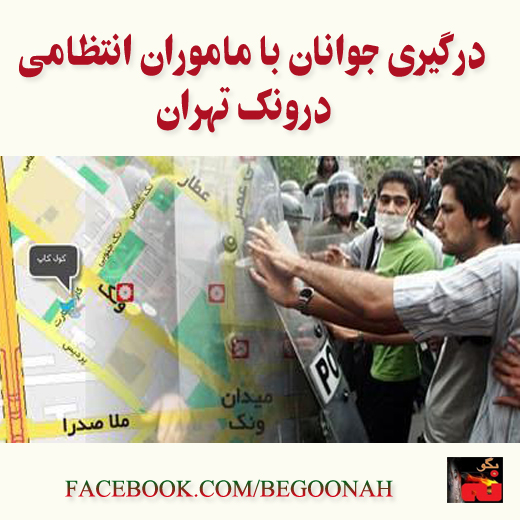 تعدادی از جوانان در ميدان ونک تهران روز دوشنبه ۱۵ ارديبهشت با مأموران سرکوبگر نيروی انتظامی که قصد دستگيری دختر جوانی را به بهانه آخوند ساخته بدحجابی داشتند، درگير شدند. مأموران سرکوبگر نيروی انتظامی در اين درگيری چند تن از جوانان را دستگير کردند.