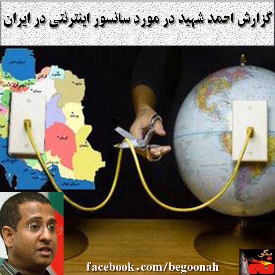 احمد شهيد گزارشگر ويژه ملل متحد برای بررسی نقض حقوق بشر در ايران، طی گزارشی در مورد سانسور اينترنتی توسط حکومت آخوندها نوشت: در رژيم ايران دسترسی به اينترنت، توهين آميز يا تخريبی انگاشته شده است و توسط قانون، محدود شده است. موجوديت رسانه ها و روزنامه نگاران و وبلاگ نويس ها و ديگر شهروندان اينترنتی، اغلب به دليل انتشار، تحت پيگرد هستند. ۳۷روزنامه نگار و شهروندان اينترنتی اخيراً در ايران. بازداشت شده اند.
