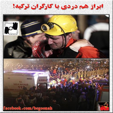 ما بعنوان بخشی از کارگران ایران متشکل در سندیکای کارگران نقاش استان البرز، کمیته پیگیری ایجاد تشکل های کارگری ، کمیته دفاع از کارگران زندانی مهاباد، جمعی از کارگران و فعالین کارگری سنندج به همراه تعدادی از کارگران زندانی و زندانیان سیاسی در ایران با دلی پر خون و چشمان گریان کشته شدن کارگران معدن سوما در ترکیه را نه حاصل حوادث کار بلکه آن را جنایت کارفرمایان و دولتشان علیه کارگران قلمداد می کنیم ، ضمن ابراز همدردی با خانواده کارگران قتل عام شده و طبقه کارگر ترکیه، از تمامی تشکل های کارگری ، سازمانها و فعالین انقلابی و مردم آزادیخواه می خواهیم کارفرمایان و نهاد های دولتی که برای کسب سود بیشتر وسائل ایمنی را کم می کنند و در خصوص کشته شدن کارگران در معدن سوما کار فرمای شرکت سوما و مسئولین دولت ترکیه را برای محاکمه بعنوان عاملین و آمرین جنایت علیه بشریت به دادگاه بکشانند. و از تمامی کارگران و تشکل های کارگری در جهت پایان دادن به کشته شدن کارگران بطور متحدانه و هماهنگ حوادث کار را بعنوان جنایت علیه کارگران در محل کار دانسته و در جهت پایان دادن به آن مبارزه کنند. فراموش نکنیم اگر متحدانه و گسترده علیه جنایات در محل کار فعالیت نکنیم، کار فرمایان برای افزایش سود سرمایه با کمتر و کمتر کردن ایمنی کار کارگران بیشتری را به قتل خواهند رساند.