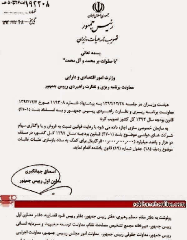 سایت حکومتی موسوم به «صبحانه» در راستای تعریف و تمجید از این حرکت ارتجاعی و ضد ملی اقدام به انتشار سندی نموده است که به امضاء اسحاق جهانگیری معاون اول ریس جمهور منتصب رسیده است.