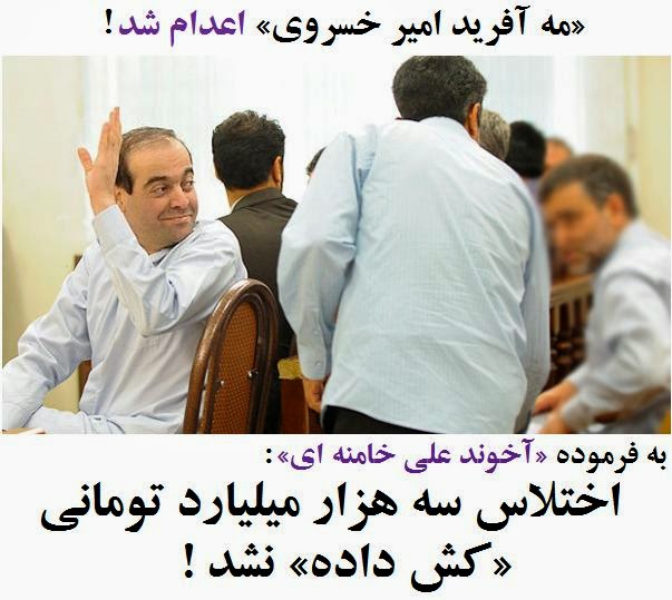 لازم به ذکر است «آخوند علی خامنه ای» رهبر حکومت جمهوری اسلامی، پس از رسوایی فساد کلان «سه هزار میلیارد تومانی» در حکومت آخوندها به «کش ندادن» این ماجرا دستور داده بود. اعدام «مه آفرید امیر خسروی» را می توان به نوعی عمل به سفارش «آخوند علی خامنه ای» در راستای فیصله دادن و سرپوش گذاشتن بر بزرگترین فساد مالی رسماً اعلام شده در حکومت آخوندها تعبیر نمود.