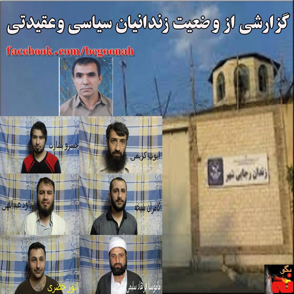 بنا به گزارش رسیده هفت زندانی عقیدتی اهل سنت به ﺍﺳﻤﻬﺎﯼ ﺧﺴﺮﻭ ﺑﺸﺎﺭﺕ ،ﮐﺎﻣﺮﺍﻥ ﺷﯿﺨﻪ ،ﺍﻧﻮﺭ ﺧﻀﺮﯼ ،ﺳﯿﺪ ﺩﺍﻭﺩ
