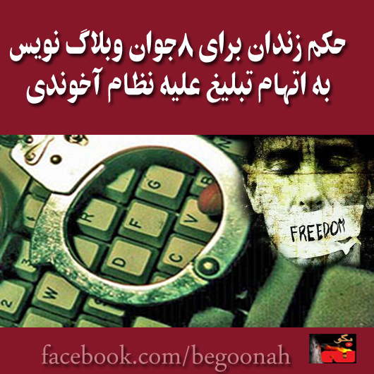 رژیم آخوندی هشت جوان وبلاگ نویس را به حبس تعزیری محکوم کرد. اتهام این جوانان ”اجتماع و تبانی، تبلیغ علیه نظام، توهین به خامنه ای و خمینی، توهین به سران سه قوه و توهین به مقدسات نظام“ اعلام شده است.