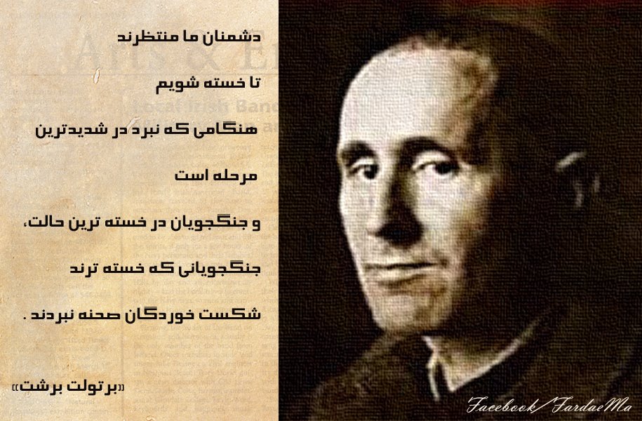 گالری فیلم و تصویر برتولت برشت Date: مِی 30, 2014Author: begoonah 0 دیدگاه دشمنان ما منتظرند تا خسته شويم هنگامي كه نبرد در شديدترين مرحله است و جنگجويان در خسته ترين حالت جنگجوياني كه خسته ترند شكست خوردگان صحنه نبردند . «برتولت برشت» 0.000000 0.000000 ۰ اشتراکگذاری این:بیشتر برای اشتراکگذاشتن فیسبوک خود کلیک کنید (در پنجرۀ تازه باز میشود) فیسبوک اشتراک گذاشتن توسط اس ام اس (در پنجرۀ تازه باز میشود) X برای چاپ کردن کلیک کنید (در پنجرۀ تازه باز میشود) چاپ برای اشتراکگذاری روی Telegram کلیک کنید (در پنجرۀ تازه باز میشود) تلگرام برای اشتراکگذاری روی WhatsApp کلیک کنید (در پنجرۀ تازه باز میشود) واتساپ