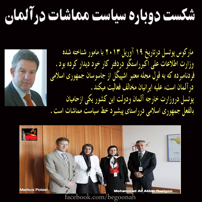 مارکوس پوتسل در تاریخ ۱۹ آوریل ۲۰۱۳ با مامور شناخته شده وزارت اطلاعات علی اکبر راستگو در دفتر کار خود دیدار کرده بود. فرد نامبرده که به قول مجله معتبر اشپیگل از جاسوسان جمهوری اسلامی در آلمان است، علیه ایرانیان مخالف فعالیت می کند. پوتسل در وزارت خارجه آلمان و دولت این کشور یکی از حامیان بالفعل جمهوری اسلامی در راستای پیشبرد خط سیاست مماشات است.