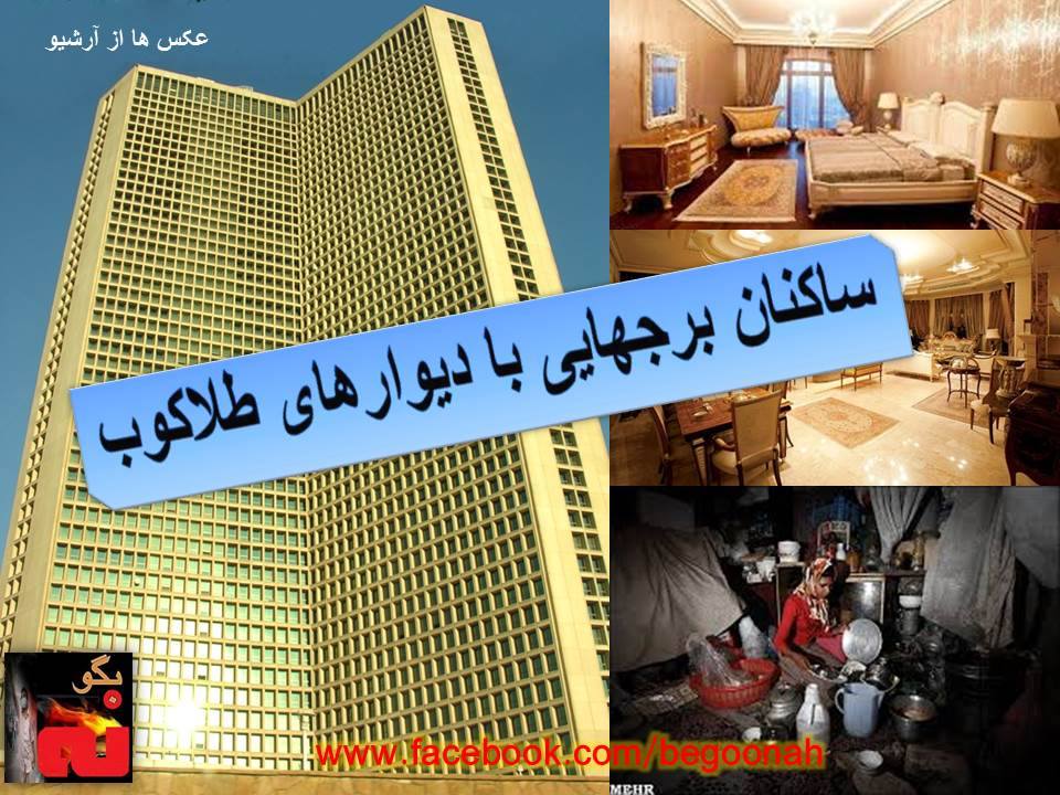امر عجیب و غربیی نیست که در سایه نظام چپاولگر آخوندی: ”در شهری که برخی دغدغه شان قطع یارانه ۴۵هزار تومانی است عده یی دیگر به دنبال خرید ملک در برج های آسمان خراش با امکاناتی هم چون دیوار طلا کوب، شیرآلات طلا، تراس هایی با وسعت بیش ازدویست متر، دید پانورامای ۳۶۰ درجه (دید سراسرنما و چهارطرفه)، سالنهای مطالعه، مبلمانهای ساخت معروف ترین برندهای دنیا، قفل و کلیدهای هوشمند و انگشتی، سونا و جکوزی اختصاصی، سالن بیلیارد، آشپزخانه با مبلمانهای مارکدار و سینمای خانوادگی هستند“.