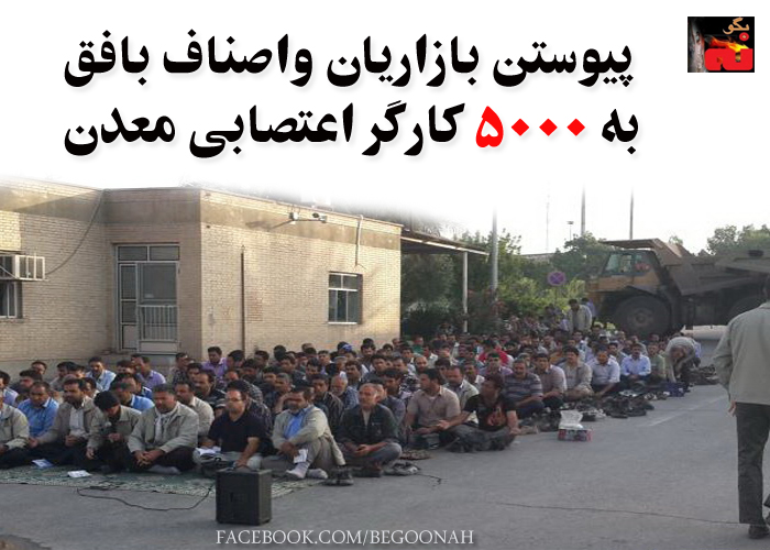 با گذشت ۳ هفته از اعتصاب بیش از ۵ هزار تن از کارگران سنگ معدن بافق در استان یزد، اصناف و بازاریان شهرستان بافق نیز در همبستگی با کارگران اعتصابی معدن سنگ آهن روز دوشنبه ۱۹ خرداد دست به اعتصاب زدند و همه مغازه های خود را بستند. بازاریان اعتصابی گفتند روز سه شنبه نیز به اعتصاب خود ادامه خواهند داد. سومین هفته خود را پشت سر گذاشت. کارگران سنگ معدن بافق در اعتراض به تحویل معدن به غارتگران حکومتی از روز یکشنبه ۲۸ اردیبهشت دست به اعتصاب زده اند. به گزارشهای دریافتی شماری از کارگران اعتصابی معدن بافق نیو برای دومین هفته متوالی در مقابل در ورودی معدن در تحصن به سر می برند.