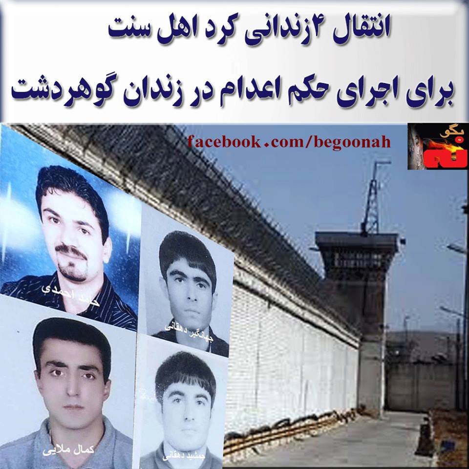 به گزارش دریافتی چهار زندانی کرد اهل سنت به نامهای: حامد احمدی، جمشید دهقانی، جهانگیر دهقانی و کمال ملا از سالن ۵ زندان گوهردشت برای اجرای حکم اعدام به انفرادی منتقل شدند.