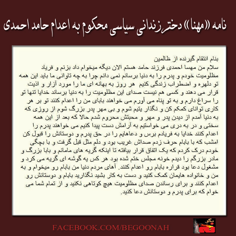 گالری فیلم و تصویر نامه دختر زندانی سیاسی محکوم به اعدام حامد احمدی Date: جون 14, 2014Author: begoonah 0 دیدگاه اشتراکگذاری این:بیشتر برای اشتراکگذاشتن فیسبوک خود کلیک کنید (در پنجرۀ تازه باز میشود) فیسبوک اشتراک گذاشتن توسط اس ام اس (در پنجرۀ تازه باز میشود) X برای چاپ کردن کلیک کنید (در پنجرۀ تازه باز میشود) چاپ برای اشتراکگذاری روی Telegram کلیک کنید (در پنجرۀ تازه باز میشود) تلگرام برای اشتراکگذاری روی WhatsApp کلیک کنید (در پنجرۀ تازه باز میشود) واتساپ